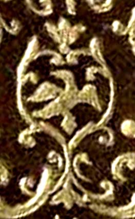 | The binding reproduced above is shown at near to full size or a small bit larger than actual size depending on your monitor settings (600x800) and is about 22cm tall. The original image is found in the British Library Database of Bookbinding. The binding has been photographed with a ruler included in the picture and thus we are able to digitally reproduce the binding at its true size. The photographic quality of this binding as quite good as it is in the smaller size range and more importantly the quality of the tooling is better than most, thus at last we have a chance to extract a fairly good imprint of the famous bird. |