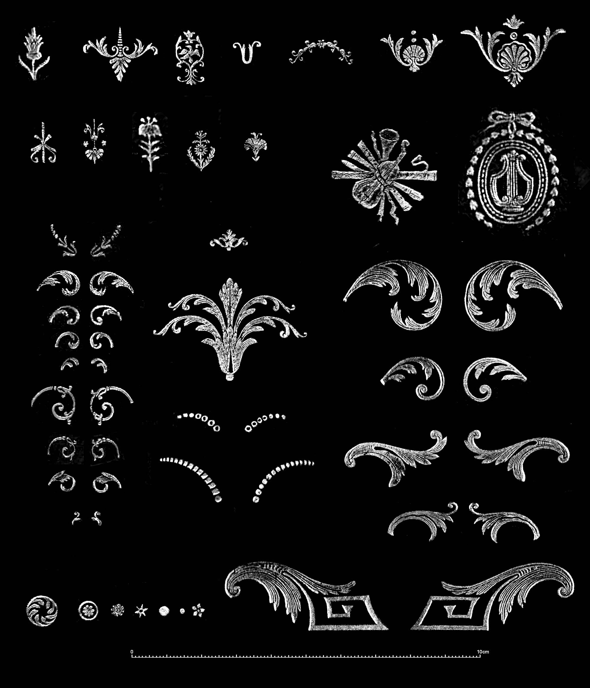 In Comparative Diagram 1, I have gathered together some important examples of this fer à l'oiseau imprint. The earliest may be the 1757 Dubuisson example, there are two Dubuisson models. In the middle is a Derome example from this davis546 binding, it is at the same scale as the Dubuisson tools. For the two other examples the scale is only my estimate. The Jubert model is easier to detect as the base is different (still Esmerian missed this in his No. 120). Some of Jubert's tools appear to have been 'borrowed' from Derome, one or two seem identical . The 'etat' model is another highly important example as it is found on many bindings which are often attributed to Derome, however the accompanying tools found with this imprint do not appear to be those of Derome. Below is a collection of the Derome imprints recovered thus far, I have added some small examples which are far from perfect, hopefully I will find more, better quality reproductions in the near future. On the next page I return to a Derome binding which seems rather mysterious, I started working on this binding before looking at all the others, now that I have gone full circle, this binding remains an enigma. |